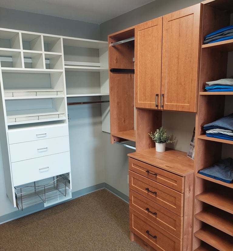 We offer custom closet options through Bayer Interior Woods' Shelvi Line of organizers. From white to woodgrain patterns, you are sure to find something to work in your space!
